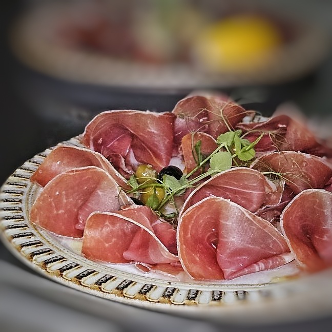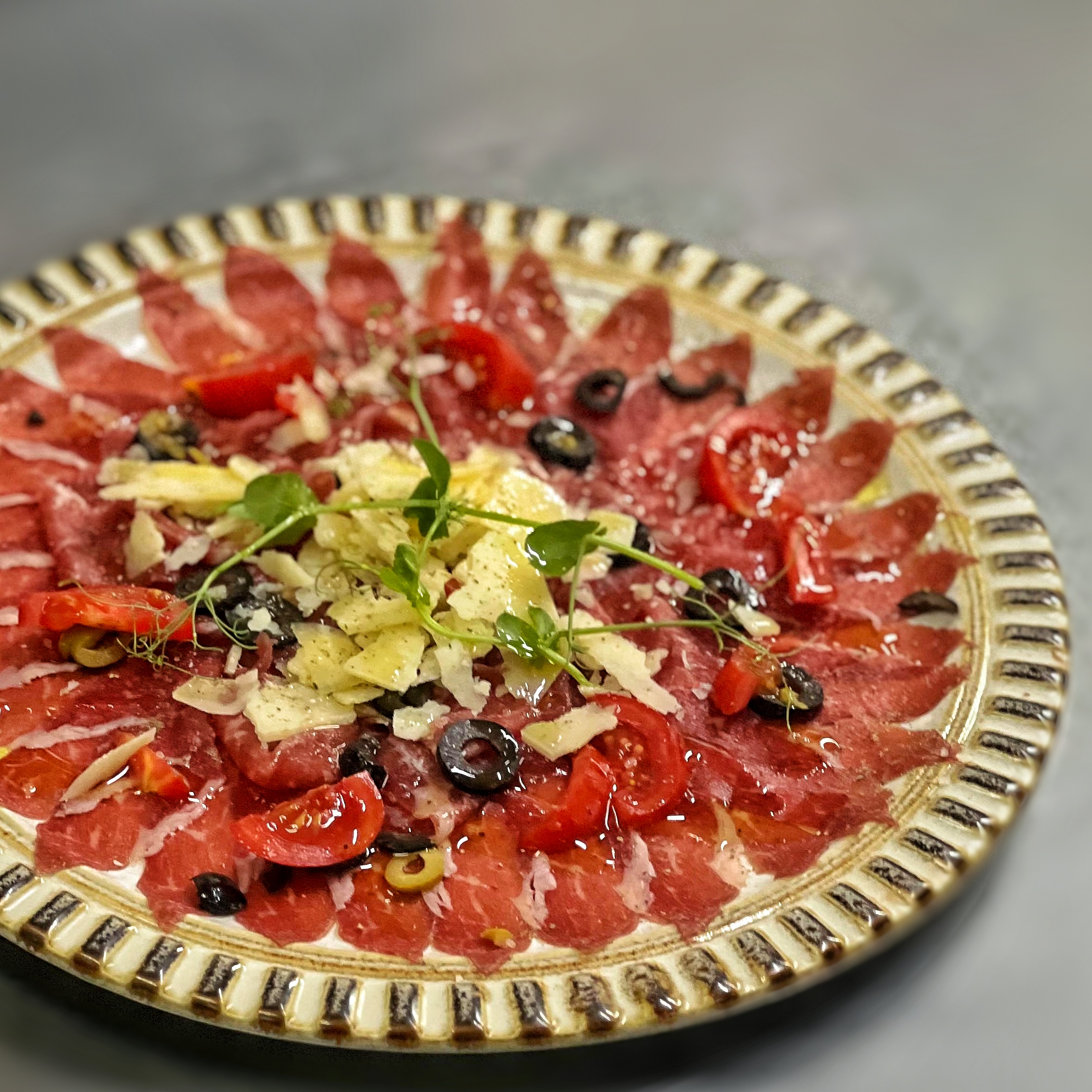 Po uzoru na inostrane kuhinje mi smo napravili naš lokalni karpaćo od domaće govedine. Juneći ramstek odležao 30 dana, rukola, stari zreli sir, čeri, limunov sok i mikro bilje.