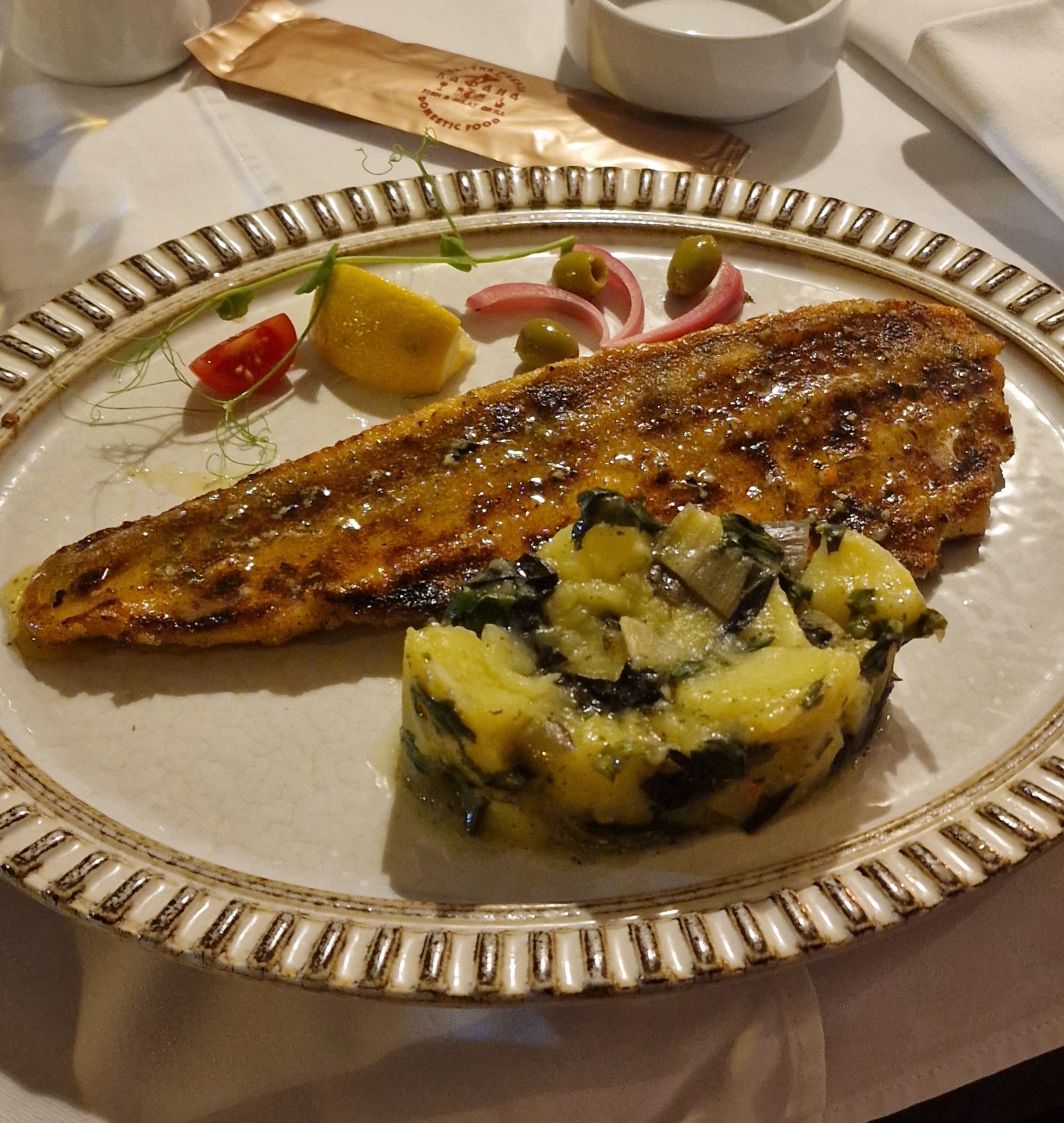 Rečna riba izlovljena u vodama Đerdapskog jezera, belog mesa prve klase, priprema se u komadu, na rošilju. Blago prelivena marinadom od belog luka, peršuna, limuna i biljnog ulja. Vrlo sočna i ukusna. Konobar je filira pred vama i servira na tanjir sa prilogom barenom blitvom, krompirom i svežim limunom.